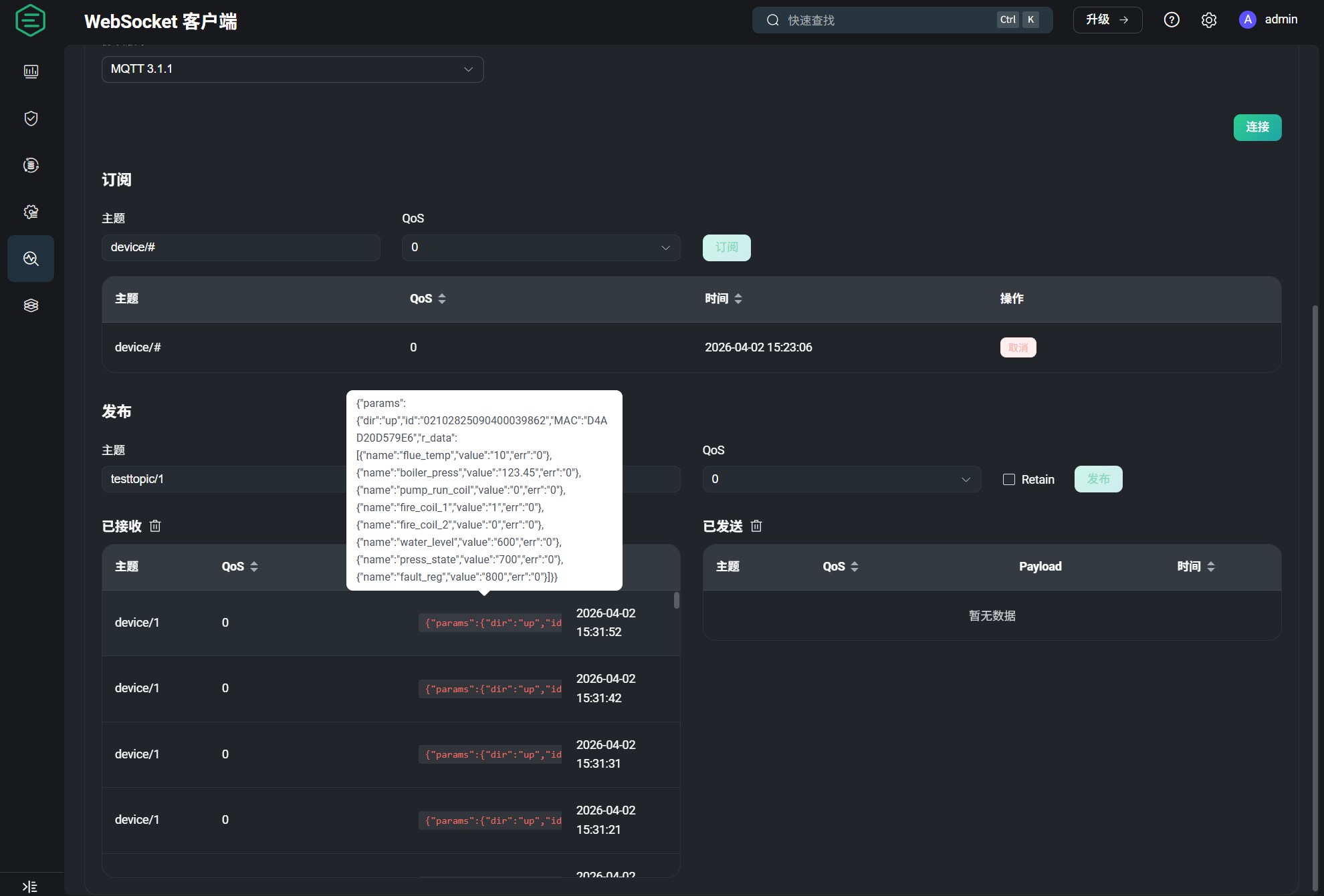使用 MQTT 客户端工具订阅 Topic,验证数据上报是否正常。